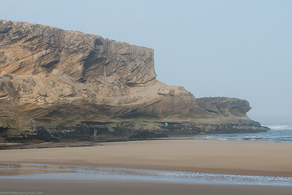 We walk up over a hill from where there is a nice outlook towards tonight´s camping site. The last stretch of today´s trek goes along the edge of the beach, below sand coloured cliffs. The local people come here at low tide to look for clams and small fish. Colourfully painted fishing boats lie drawn up on the beach. We pitch our camp in a small group of trees at the outskirts of the small village of Sidi Kaoki.