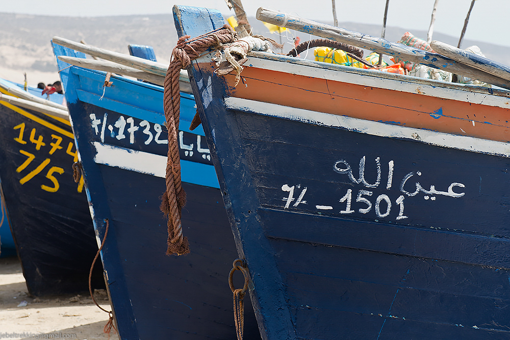 Late in the afternoon we arrive in the holiday village of Tafedna, with its rows of white-painted houses with their blue window shutters. We camp overlooking the inviting beach, just outside the village. Perhaps we will take a short ride on a dromedary in the sunset.